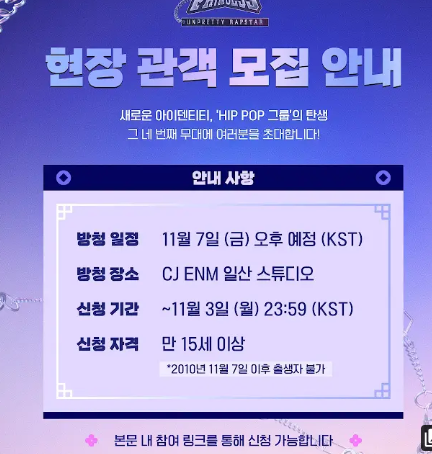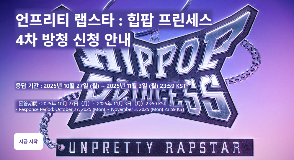 〈언프리티 랩스타 : 힙팝 프린세스〉는 매주 목요일 밤 9시 50분 Mnet에서 방송 중이며, 데뷔를 향한 소녀들의 성장과 치열한 무대 경쟁이 펼쳐지고 있습니다. 직접 그 현장을 체험하고 응원할 수 있는 방청 기회는 흔치 않은 만큼, 참여를 원하는 분들은 신청 기한 내에 꼭 접수하시기 바랍니다.