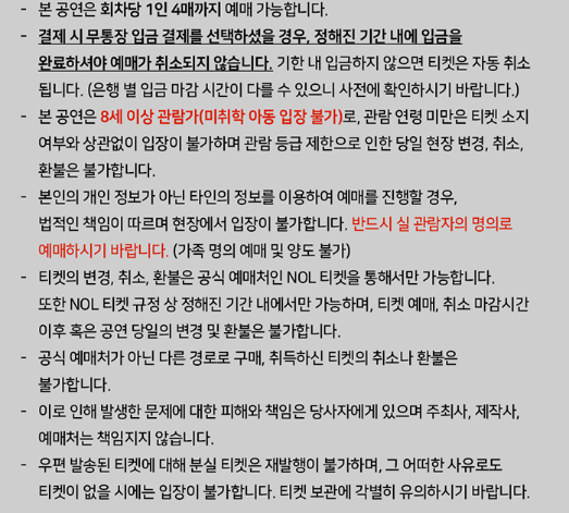 - 예매 매수 제한: 1인당 회차별 최대 4매까지 가능