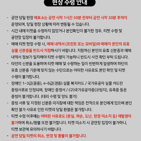 - 예매 내역서(모바일/출력 모두 가능)와 본인 실물 신분증 필참