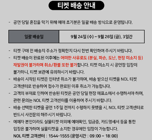 공연 당일엔 반드시 티켓 실물을 지참해야 하며, 예매 내역만으로는 입장이 불가능합니다.