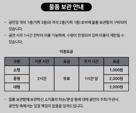 공연장 내 물품보관소는 1층과 2층 로비에 마련되어 있으며, 공연 시작 1시간 전부터 운영됩니다.