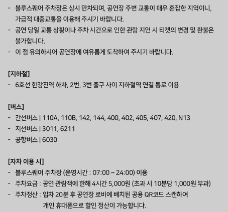 단, 공연 당일에는 주차장이 금방 만차되며 인근 도로도 매우 혼잡하니 대중교통 이용을 권장드립니다.