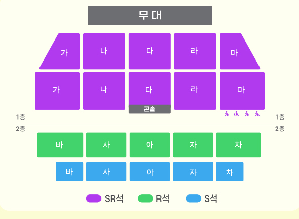 모든 좌석은 지정좌석제로 운영되며, SR석은 무대와 가장 가까운 프리미엄존입니다.