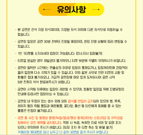 - 미취학 아동은 입장 불가이며, 1인 1티켓 원칙이 적용됩니다.