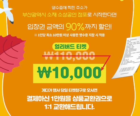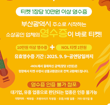 부산 지역 소상공인 매장에서 결제한 10만 원 이상의 영수증이 있으면 콘서트 입장권으로 활용할 수 있어요.