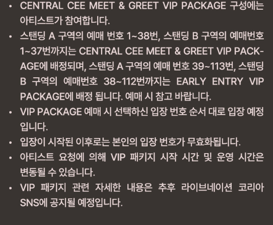 - 티켓 가격: CENTRAL CEE MEET & GREET VIP PACKAGE 344,000원