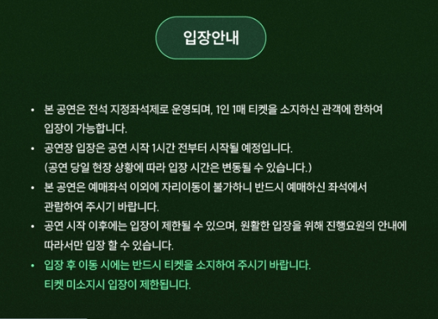 - 공연 시작 후 지연 입장 시, 안내에 따라 지정 구역에서 관람