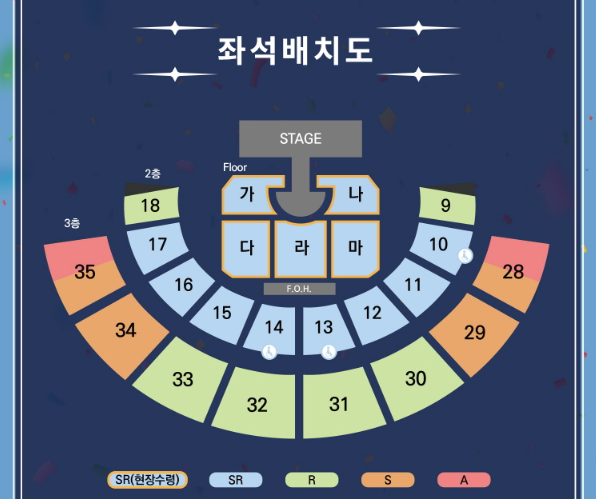 ※ 좌석 등급은 무대와의 거리, 시야 확보 정도에 따라 구분됩니다. SR석은 무대와 가장 가까운 프리미엄존입니다.