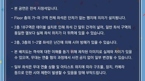 - 2층/3층 중앙 또는 측면 중앙 섹션을 추천합니다. 높은 곳이라도 무대 전체가 잘 보이는 장점이 있습니다.