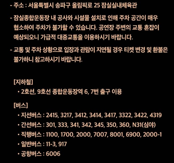 - 지하철: 2호선, 9호선 종합운동장역 6,7번 출구 이용