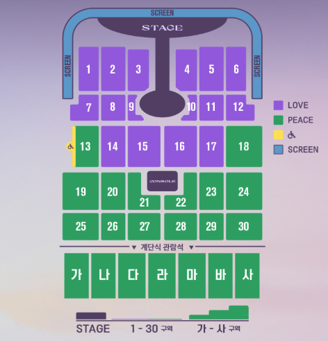 - 가~사 구역: 계단식 좌석(단차 있음)