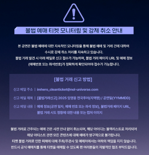 불법 거래로 인한 피해 발생 시 주최사 및 예매처는 책임지지 않음
