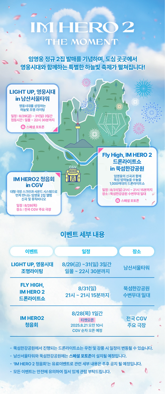 임영웅 두 번째 정규 앨범 ‘IM HERO 2 – THE MOMENT’ 발매 기념 하늘빛 청음회가 8월 28일 전국 CGV에서 개최됩니다. 신곡·MV 최초 공개, 남산타워 라이팅, 뚝섬 드론쇼 등 컴백 이벤트 총정리.