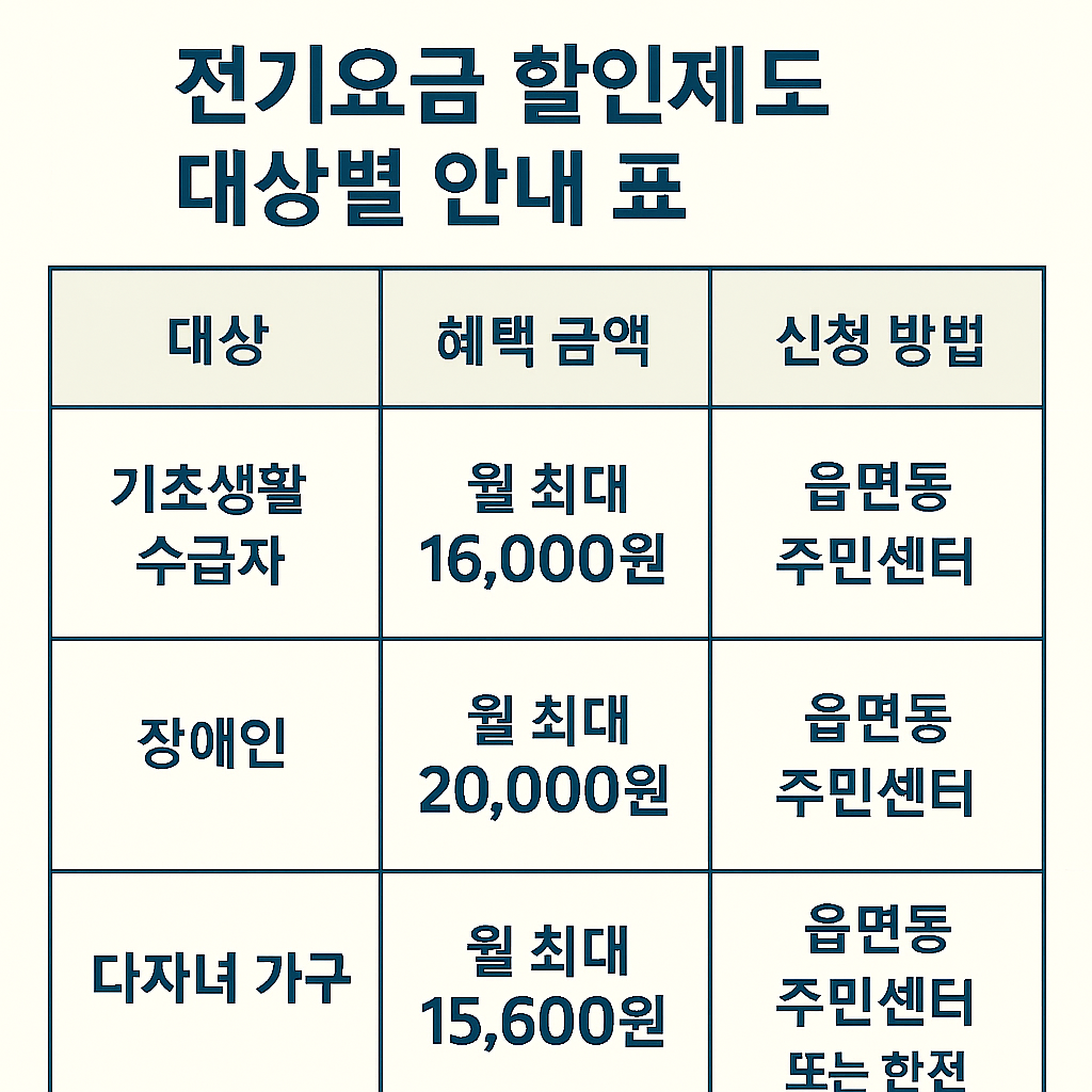 전기요금 부담을 줄이는 가장 확실한 방법! 기초생활수급자, 장애인, 국가유공자, 다자녀가구 등을 위한 전기요금 할인제도를 신청 자격부터 절차, 준비서류, 할인금액까지 완벽하게 정리했습니다. 누구나 받을 수 있는 복지 혜택, 지금 확인하세요.