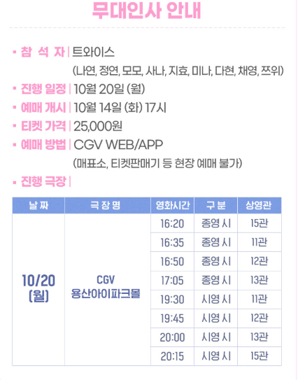 트와이스 멤버들이 직접 관객들과 만나는 무대인사 일정도 예정되어 있습니다!