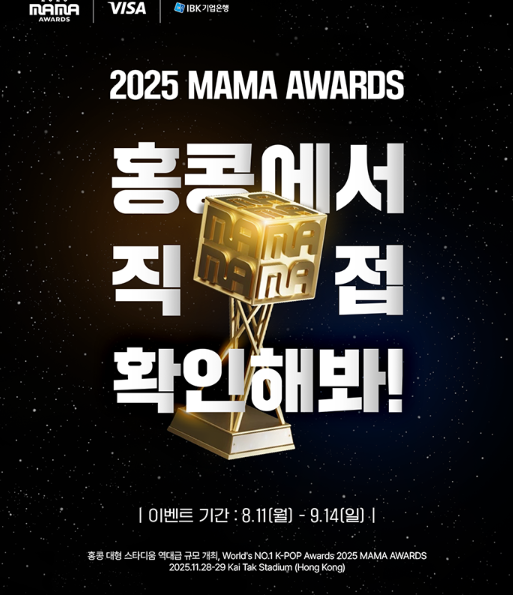 2025 MAMA 홍콩 개최 확정! Kai Tak Stadium에서 11월 28일~29일 양일간 열리는 MAMA 2025 일정, 티켓 예매 및 무료 초대 이벤트, IBK Visa 카드 혜택, 수상 부문 총정리를 한눈에 확인하세요.